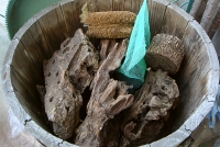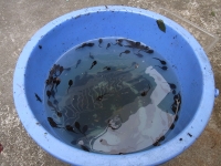 ここのところ、人工池の水が濁って来ていました。少し餌をやり過ぎて、それが傷んだのかも知れません。底の泥をすくってみると、嫌気性の細菌が沸いたと思える臭いがする。要するに泥までが腐っているのです。このままでは水質がどんどん悪くなって、生存に悪影響が出そう。おたまじゃくしをバケツにすくって、池の水を一旦汲み出して、汚泥を除去しました。