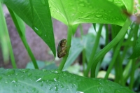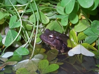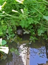 そしてちょっと離れた所にあるプランターを使ったオモダカ用のビオトープに、立派なヒキガエルが休んでおりました。一見すると体格が小柄でこいつは雄っぽいな。ならば、卵を産んだ雌はどこか別の場所に?このヒキガエルは、恐らく二年前に私が世話していたオタマジャクシのうちの誰か。育った場所を憶えていて、戻ってきたのだと思われます。