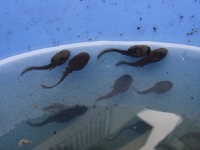 おたまじゃくしの様子は・・・生まれた時期が一月近く遅かったと書きましたが、その後順調に成長しています。この数日で、後ろ脚が出て来たのが確認できました。この後は、急速に成長が進むことでしょう。小さな蛙となって陸地に上がる日がたのしみであります・・・