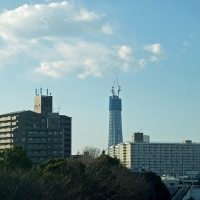 今日、久しぶりに秋葉原からJR総武線で千葉方面に向かう途中のこと。錦糸町を過ぎたあたりで、車窓からその姿を初めて目視しました。かなりの距離があるのにとても大きく感じました。完成すると634mになる予定なので、まだ1/3の高さなのです。それなのに随分目立っているではないですか!電車の窓越しにスナップを撮りました。