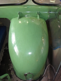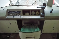 これはボンネットに収まっているはずのエンジンシャフト部がカバーに守られて車内に飛び出ているのでした。結果このバスは、ボンネットバスと同じ構造であると思われます。ちなみに製造年月日は昭和26年製。