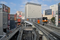 街中を突っ切るモノレールの柱は、本来なら視界を邪魔する余計な建造物かと思います。それでも車両が行き来するその様を見ていると、そんなに悪い風景に見えないのは不思議なこと・・・昔絵本で見た未来都市のイメージにも近い感じ。私は鉄道オタク程では有りませんけれど、モノレールの写真を撮るためにその場でしばらく時間を潰しておりました・・・